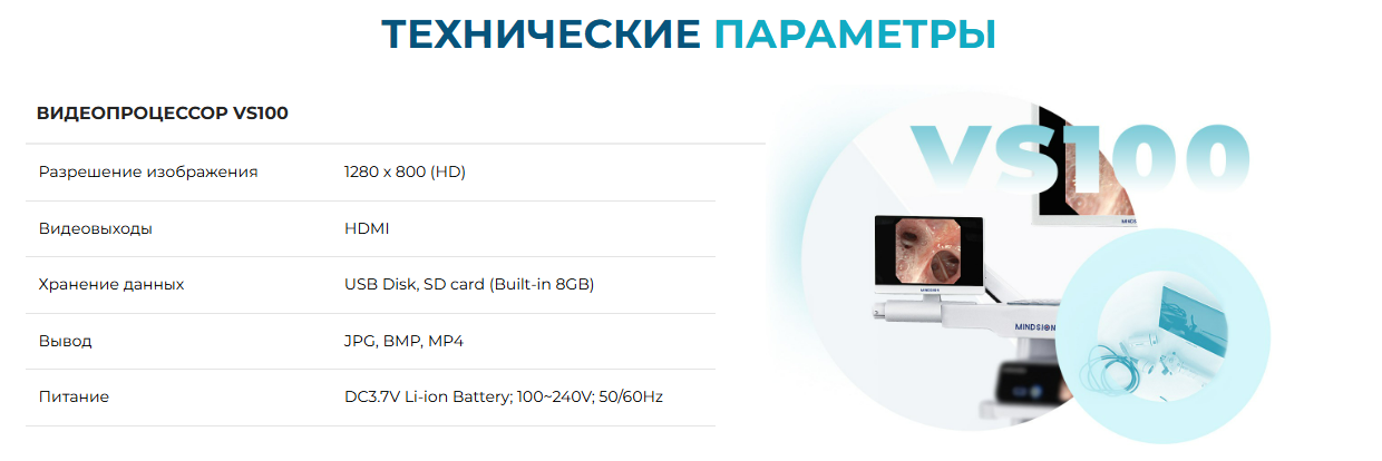 Видеопроцессор VS100 предназначен для вывода изображений на 10" экран и сенсорного управления работы при проведении эндоскопии
